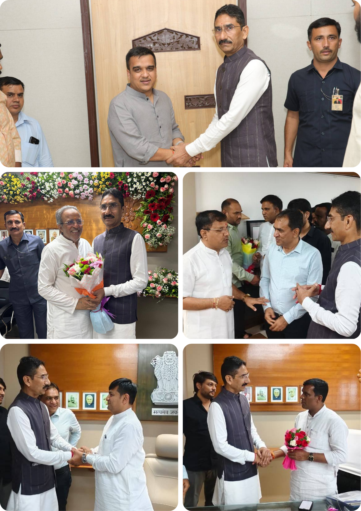 આજ રોજ ગુજરાત રાજ્યના યુવા અને ગતિશીલ નેતા શ્રી હર્ષ સંઘવી સાહેબને રાજ્યના સૌથી યુવા નાયબ મુખ્યમંત્રી બનવા બદલ શુભેચ્છા મુલાકાત લઈ તેમને હાર્દિક શુભેચ્છાઓ પાઠવવામાં આવી. સાથે સાથે નવનિયુક્ત કેબિનેટ મિનિસ્ટરશ્રી શ્રી અર્જુનભાઈ મોઢવાડિયા (વન અને પર્યાવરણ, જળવાયુ પરિવર્તન, વિજ્ઞાન અને ટેકનોલોજી), ડૉ. પ્રદ્યુમન વાઝા (શિક્ષણ અને સામાજિક ન્યાય-સશક્તિકરણ), રાજ્ય સરકારના મંત્રીશ્રી પ્રવીણભાઈ માળી (વન અને પર્યાવરણ), અને ડૉ. જયરામભાઈ ગામીત (રમતગમત, ઉદ્યોગ અને પર્યટન) જેવા મંત્રીશ્રીઓનું અભિવાદન કર્યું. આપશ્રીઓ દૃઢ નેતૃત્વ અને સેવાભાવી દૃષ્ટિકોણ ગુજરાતના યુવાનોમાં નવી પ્રેરણા જગાવશે, અને શિક્ષણ તથા ઉદ્યોગ ક્ષેત્રે નવો વિકાસ લાવશે, જે ગુજરાતના સર્વાંગી વિકાસ માટે અત્યંત મહત્વપૂર્ણ છે.
